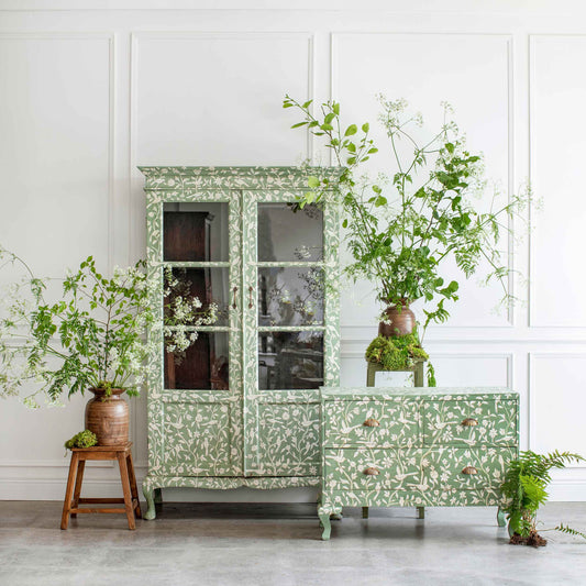 Starting with a sketch and working closely with expert artisans, Carla created the Birdie pattern, a delicate vine adorned with flowers and birds. Combined with Carla’s favourite shades of green, the unique pattern was hand-painted onto three key antique pieces: two dressers and a chest of drawers.
