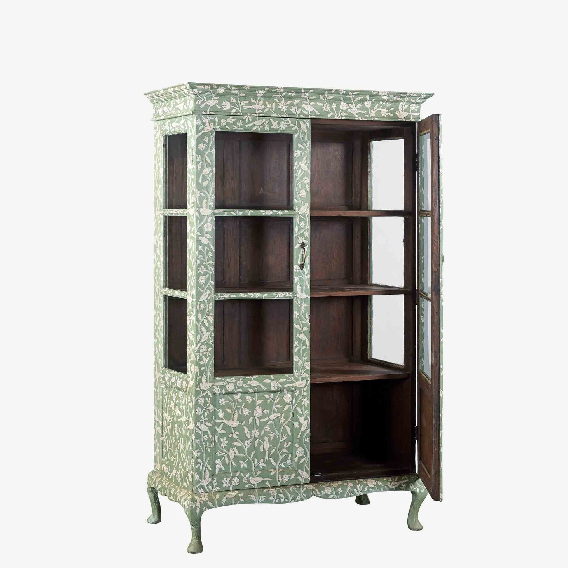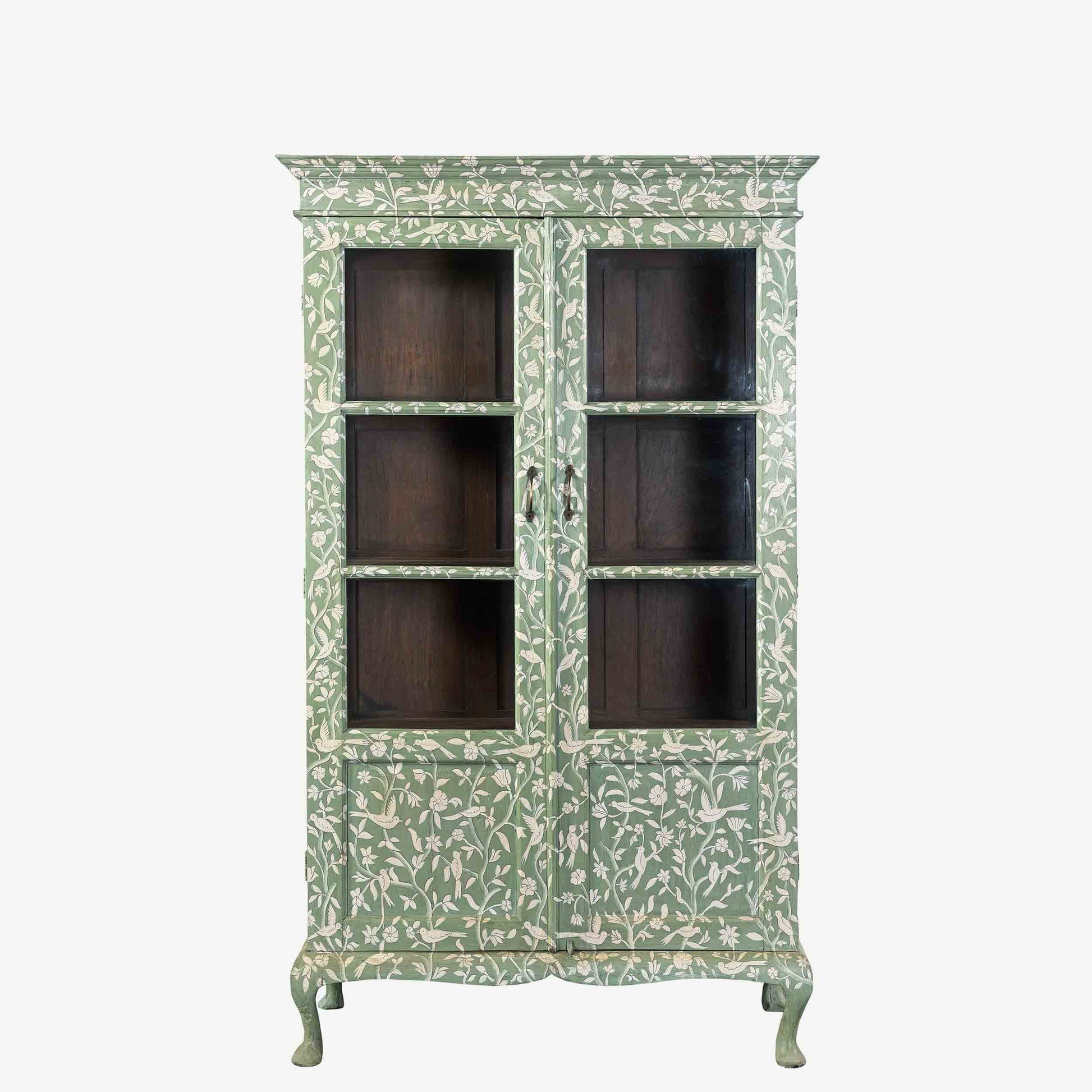 Featuring a hand painted pattern atop HMcG colour Hampstead Green, glazed double doors with antique gold hardware, charming saber legs, three shelves and original teak interior.